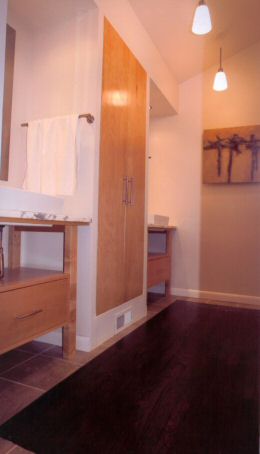 Each vanity has its own sink, mirror and light fixture, with a linen