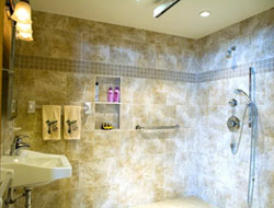 This bathroom project was for an eight-year-old quadriplegic boy with Cerebral Palsy and no muscle control. Completing the bathroom on the ground floor gives him a wheelchair accessible bathroom and the ability to live in the bedroom across the hall. Prior to this remodel, it was necessary to manually move and shift him a minimum of seven times each morning to get him ready for the day. Today, after the remodel, he needs to be lifted only three times, and two of those times a new ceiling lift is used. One of the more unique and functional additions was a custom made changing table that allows the boy to be more thoroughly dried-off after bathing. As the client says, "This remodeled bathroom makes bathing, toileting and grooming so much easier on him as well as his caregivers. The custom made changing table is a back saver and makes it possible to keep him warm and dry while dressing." After this remodel, it will be possible for the young man to live in this house for the rest of his life.